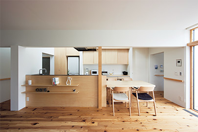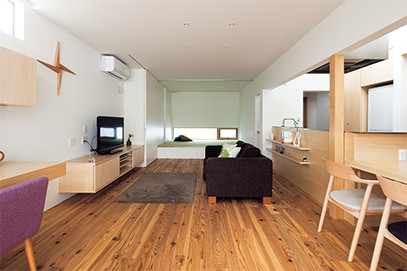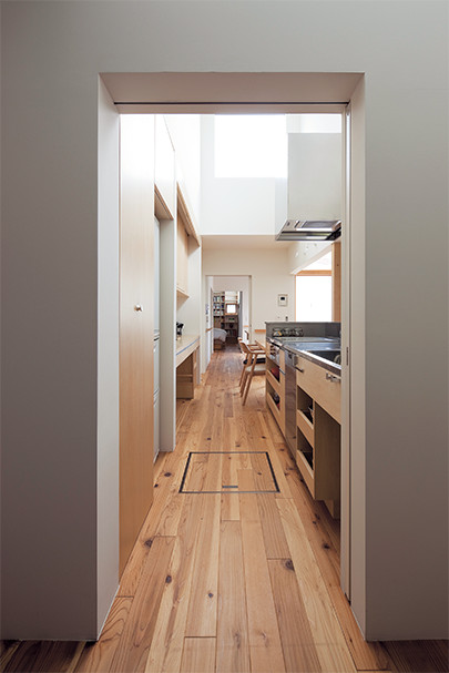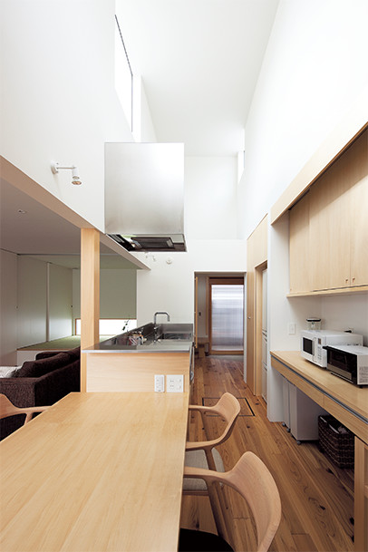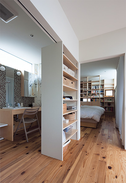 他にも、キッチン・ダイニングにはハイサイドを設けて明るく料理を楽しんだり、気軽に腰掛けられる小上がりスペースや、天窓のある浴室、本棚に囲まれた図書コーナーがある。これらはクライアントとの会話から生まれた有意義なプランだが、住み手の中に介在している生活環境をすべて読み込むことができたかは分からない。でも、安心感とわくわく感が同居する、空気がゆったりと流れるようなこの空間こそが、この家の住人のためのものになったはずだ。