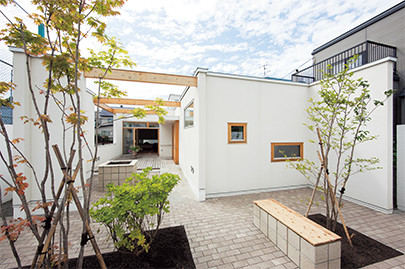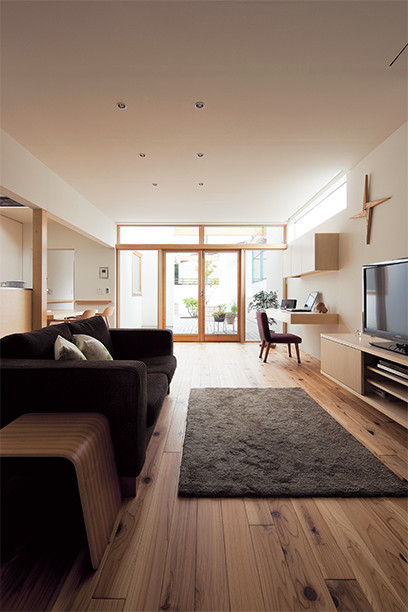 さらに、この家の最大のポイントは、内外が一体になるテラスである。リビングの窓を開けると、奥行約5.5mのテラスから庭へと続き、家にいながらも外へ外へと意識を開放してくれる。外の気配という安心感だけでなく、気軽に出入りができる身近な空間である。しかも家事動線上に洗濯コーナーもあるので、陽当たりも良く日々の家事が気持ちよく行える。
