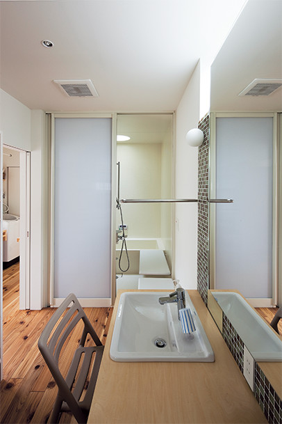 機能面では、車椅子も含めた動線を留意し、廊下も排している。例えば、車から降りてすぐ室内に入れるようにアプローチを兼ねたカーポートから、木製の玄関引戸を開けて家の中に入る。キッチンから洗濯コーナーと家事動線がつながり、衣類を収納・脱ぎ着できるようにクローゼットまたは洗面脱衣室が隣接する。浴槽まで座って移動できるように、脱衣室からつなげてベンチを作った。また、動きのシミュレーションも都度確認しながら、スペース配分や高さ・幅などの寸法も調整している。